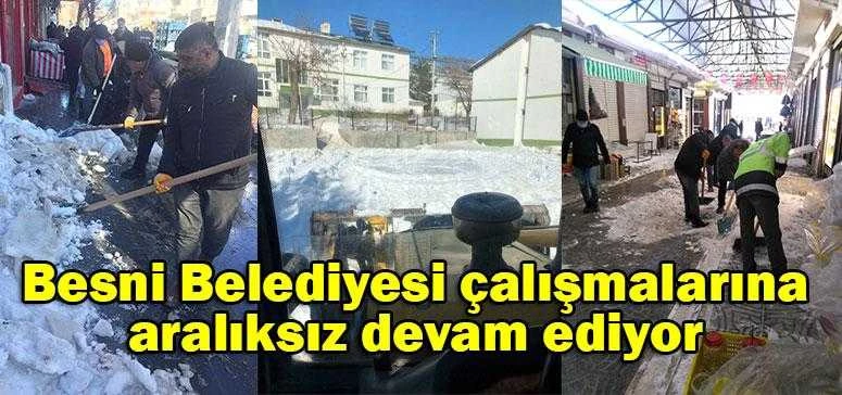 Şuana kadar büyük bir özveriyle çalışmalarını sürdüren Besni Belediyesi ilçe merkezindeki ana ve ara yolları kardan temizleyerek trafiğe açtı. Öte yandan belediyedeki bütün birim amirlerinin çalışmalara katılması takdir toplarken ilçedeki bütün cadde ve sokaklarında kardan temizlenmesi için çalışmaların devam edeceği öğrenildi.