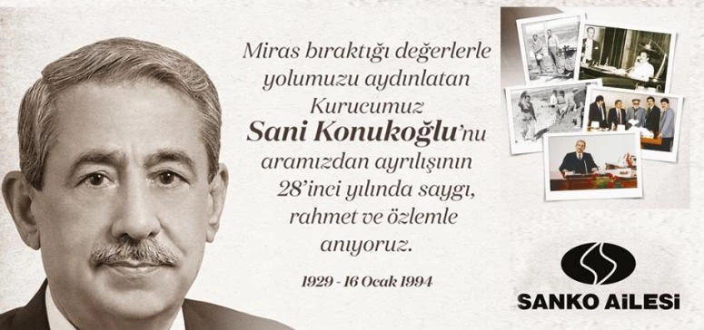 SANKO Holding'in kurucusu ve Anadolu'da sanayileşmenin öncülerinden olan Sani Konukoğlu, 28 yıl önce ebediyete intikal etmesine rağmen, öğretileri ile günümüzde de SANKO'nun, ailesinin ve sevenlerinin yolunu aydınlatıyor.