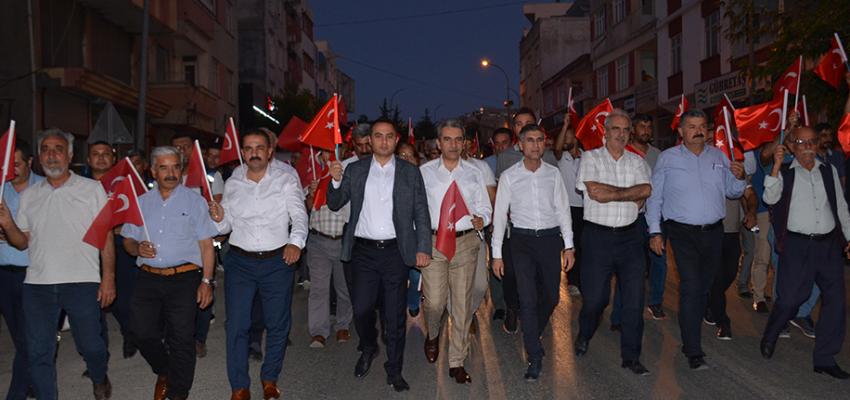Programın akşam etabında ise Besni Servi Erdemoğlu Mesleki ve Teknik Anadolu Lisesi önünden hükümet konağı önüne kadar kortej yürüyüşü düzenlendi. Yürüyüşün ardından hükümet konağı önünde devam eden program saygı duruşu İstiklal Marşı, Kuran-ı Kerim tilaveti ve sala okunması ile başladı.