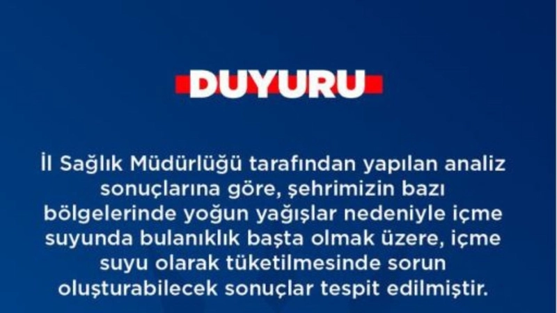 "İl Sağlık Müdürlüğü tarafından yapılan analiz sonuçlarına göre, şehrimizin bazı bölgelerinde yoğun yağışlar nedeniyle içme suyunda bulanıklık başta olmak üzere, içme suyu olarak tüketilmesinde sorun oluşturabilecek sonuçlar tespit edilmiştir. Depolarımızda klorlama başta olmak üzere gerekli tüm tedbirler alınmıştır. Analiz sonuçları normal değerlere döndüğünde kamuoyu ile paylaşılacaktır. Şebeke suyunun, ikinci bir duyuruya kadar yalnızca kullanma suyu olarak tüketilmesi önemle duyurulur. Süreç, İl Sağlık Müdürlüğü ve ASKİM ekiplerimiz tarafından titizlikle takip edilmektedir." İfadelerine yer verildi.