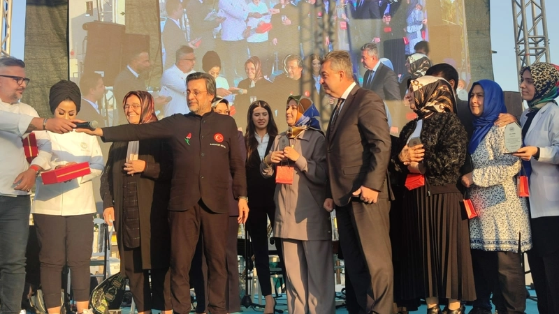 Adıyaman'ın geleneksel yemekleri ve coğrafi işaretli ürünlerinin tanıtımına katkı sunan ünlü şeflere, Vali Dr. Osman Varol tarafından teşekkür plaketi takdim edildi.