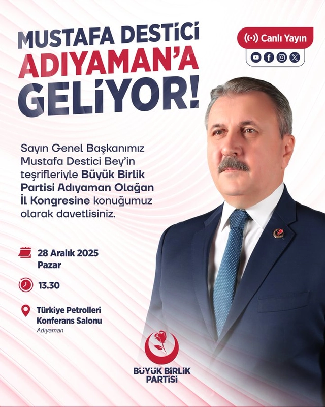 BBP Genel Başkanı Destici'nin, 28 Aralık Pazar günü Türkiye Petrolleri Konferans Salonu'nda yapılacak Adıyaman Olağan İl Kongresi'ne katılması ve kentte çeşitli temaslarda bulunması bekleniyor. Kongre programının saat 13.30'da başlaması planlanıyor.