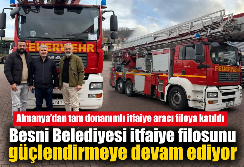 Besni Belediye Başkanı Reşit Alkan, Belediye Meclis Üyesi Cüneyt Yaşar ile birlikte Almanya'da gerçekleştirdiği incelemeler neticesinde, 44 metre merdiven uzunluğuna ve 300 kilogram taşıma kapasitesine sahip tam donanımlı bomlu sepetli itfaiye merdiveni aracının belediyenin kendi imkânlarıyla satın alındığını açıkladı. Söz konusu araç, Besni Belediyesi İtfaiye Müdürlüğü bünyesinde hizmet verecek.