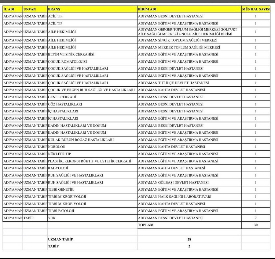 29’u uzman tabip toplamda 30 hekim ataması sonucunda Besni’ye atanan doktor branşları ise şu şekilde oluştu; “ 1 Çocuk Sağlığı ve Hastalıkları Uzmanı, 1 Genel Cerrahi Uzmanı, 1 Göz Hastalıkları Uzmanı, 1 İç Hastalıkları Uzmanı, 1 Kadın Hastalıkları ve Doğum Uzman, 1 Acil Tıp Uzmanı ve 2 Tabip”