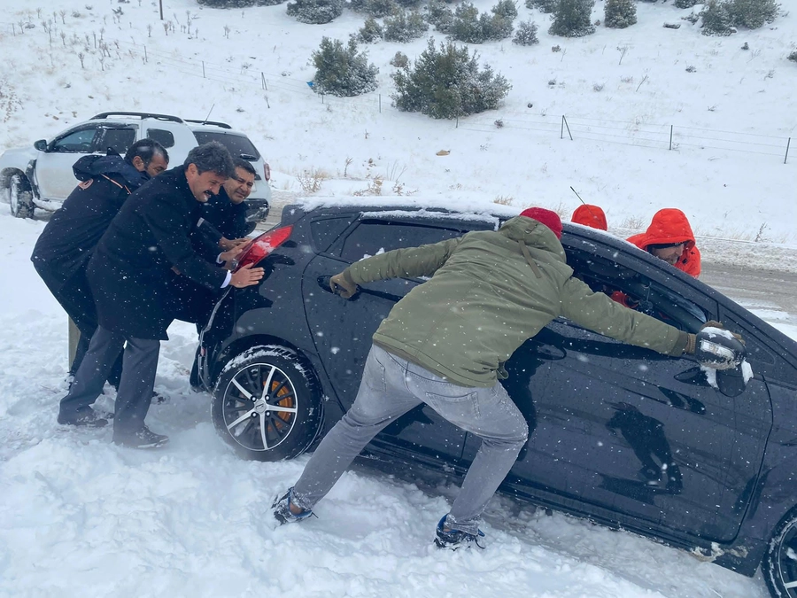Personellere kolaylıklar dileyen Kaymakam Aslan, Gaziantep Yolu üzerinde kar nedeniyle kayarak orta refüje düşen bir araca da ekiplerle birlikte yardım etti.