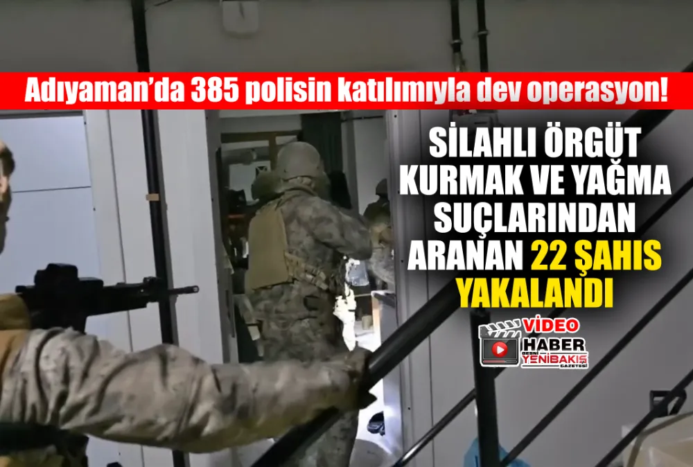 Adıyaman Emniyet Müdürlüğü ekiplerince Suç İşlemek Amacıyla Silahlı Örgüt Kurmak ve Nitelikli Yağma suçları işlediği tespit edilen şahıslara yönelik yürütülen çalışma kapsamında 385 personelin katılımıyla düzenlenen operasyonda örgüt üyesi 22 şahıs yakalandı.