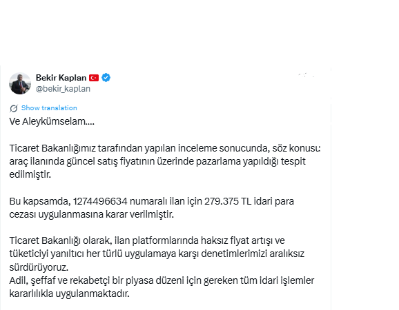 Ticaret Bakanlığı Basın Danışmanı Bekir Kaplan, sosyal medya platformu üzerinden "Ve Aleykümselam" diyerek yaptığı açıklamada, yapılan inceleme sonucunda söz konusu araç ilanında güncel satış fiyatının üzerinde pazarlama yapıldığının tespit edildiğini duyurdu. Kaplan, açıklamasında şu ifadeleri kullandı: