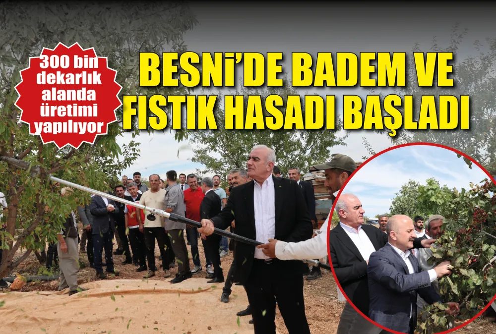 Besni’de 300 bin dekar alanda üretimi yapılan ve ilçe ekonomisinin can damarı olan fıstık ve bademin hasadı il ve ilçe protokolünün katılımıyla başladı.