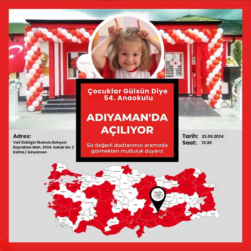 Çocuklar Gülsün Diye Derneği, Türkiye genelinde ihtiyaç duyulan bölgelere anaokulları kazandırmaya devam ediyor. Şimdiye kadar Tokat’tan Mardin’e, Trabzon’dan Van’a kadar birçok ilde 53 anaokulu açan dernek, afet bölgelerinde de faaliyetlerini hızlandırmış durumda. Adıyaman’ın Kahta ilçesindeki bu yeni anaokulu ile dernek, depremden etkilenen çocukların eğitimine destek olmayı sürdürüyor.