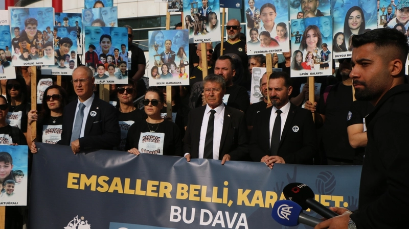 Depremde yaşamını yitiren Kıbrıslı çocukların, öğretmenlerin ve turizm rehberlerinin aileleri, adliye önünde basın açıklaması yaptı. Ellerinde kaybettikleri yakınlarının fotoğraflarını taşıyan aileler, sanıkların "olası kast"la yargılanmasını istedi.