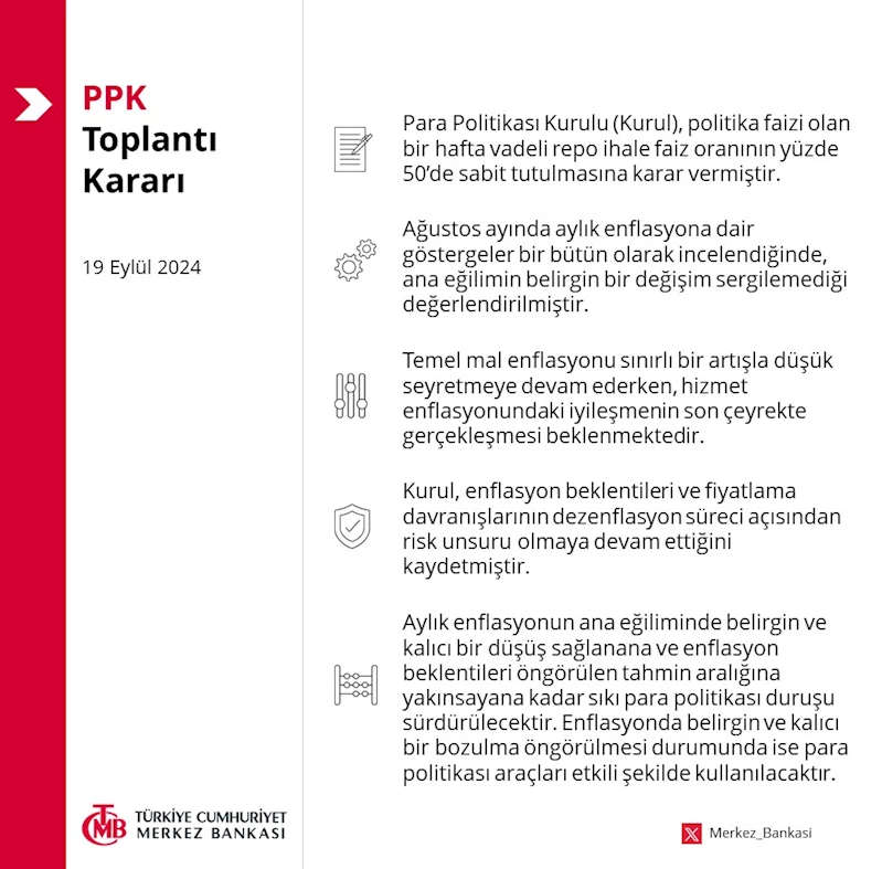 Para Politikası Kurulu, fiyat istikrarı temel hedefi doğrultusunda adımlar atacağını ve kararlarını veri odaklı, şeffaf bir çerçevede almaya devam edeceğini bildirdi. Toplantı özetinin beş iş günü içerisinde yayımlanacağı duyuruldu.