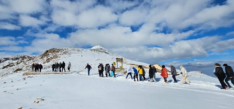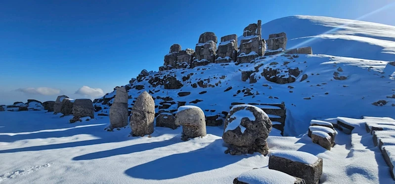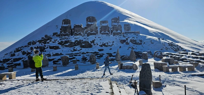 Uzun süredir havaların sıcak geçmesi ve bayramın 9 güne çıkması ile yoğun bir turist akınına uğrayan Nemrut Dağı’nda Nisan ayının ortalarında yağan kar, ziyarete gelen turistlere sürpriz yaptı.
